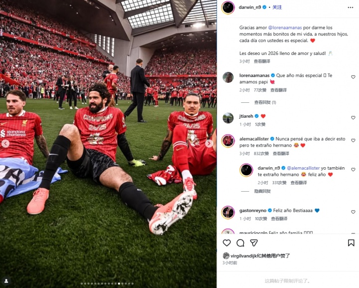 努涅斯发布社媒告别2025,麦卡利斯特不才面留言:我从未思过会说出这句话,但我确切很思你,手足。努涅斯恢复:我也思你,手足 😂 新年兴隆。