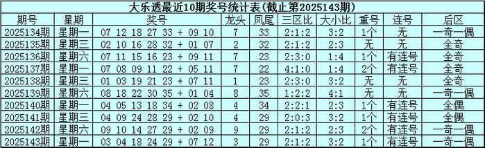 大乐透第2025143期奖号为:03、04、18、24、29+07、12。其中前区三区比为2:1:2,大小比为3:2,包含1个重号,包含连号,后区为一奇一偶号码。