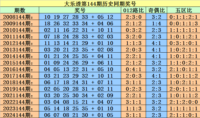 上期开奖:大乐透第2025143期开奖:03、04、18、24、29+07、12,前区012路比为3:1:1,奇偶比为2:3,五区比为2:0:1:1:1,大小比为3:2。
