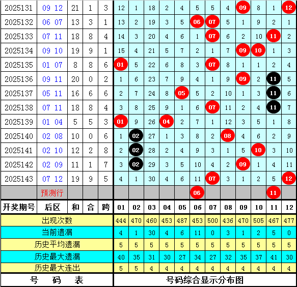 小霸王大乐透第2025144期历史同时后区定位分析